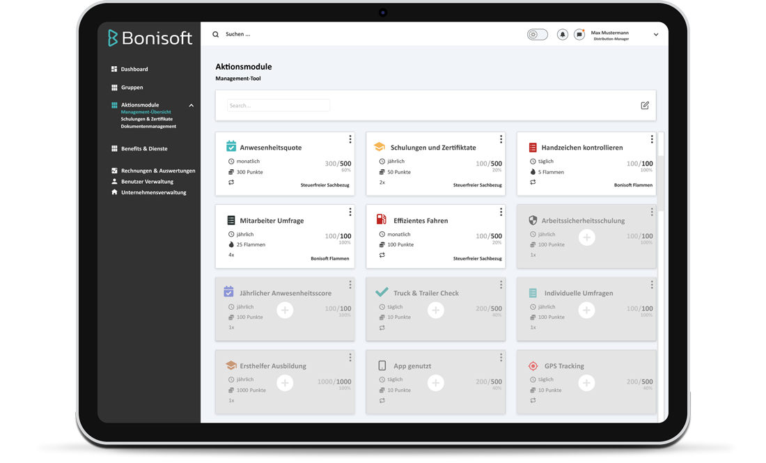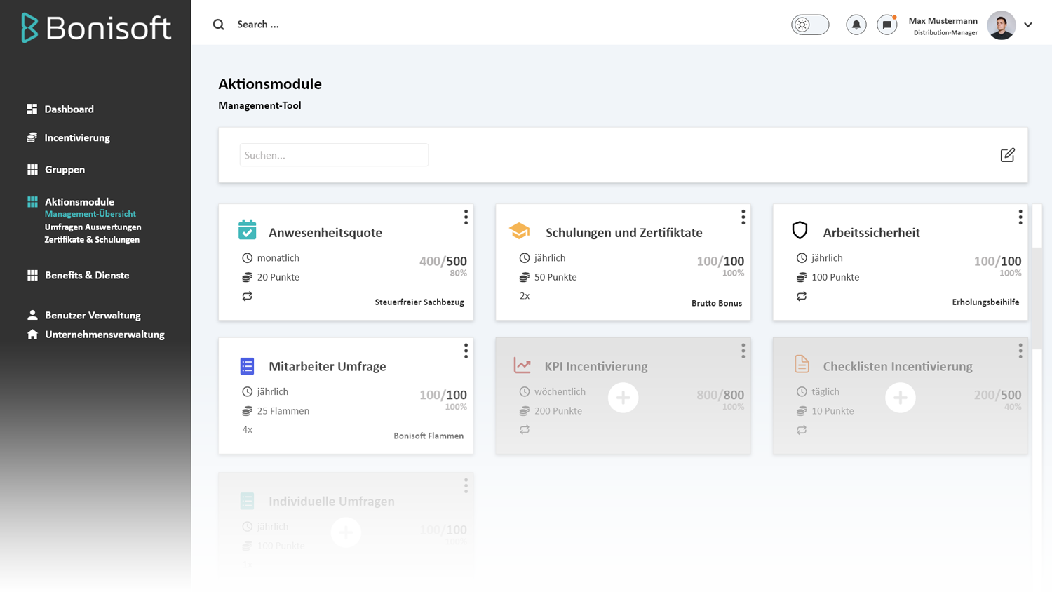 Das Management-Tool für Führungskräfte – Melden Sie sich an und erhalten Sie einen Überblick über all Ihre Aktionsmodule wie Schulungen, Mitarbeiter-Umfragen & mehr.